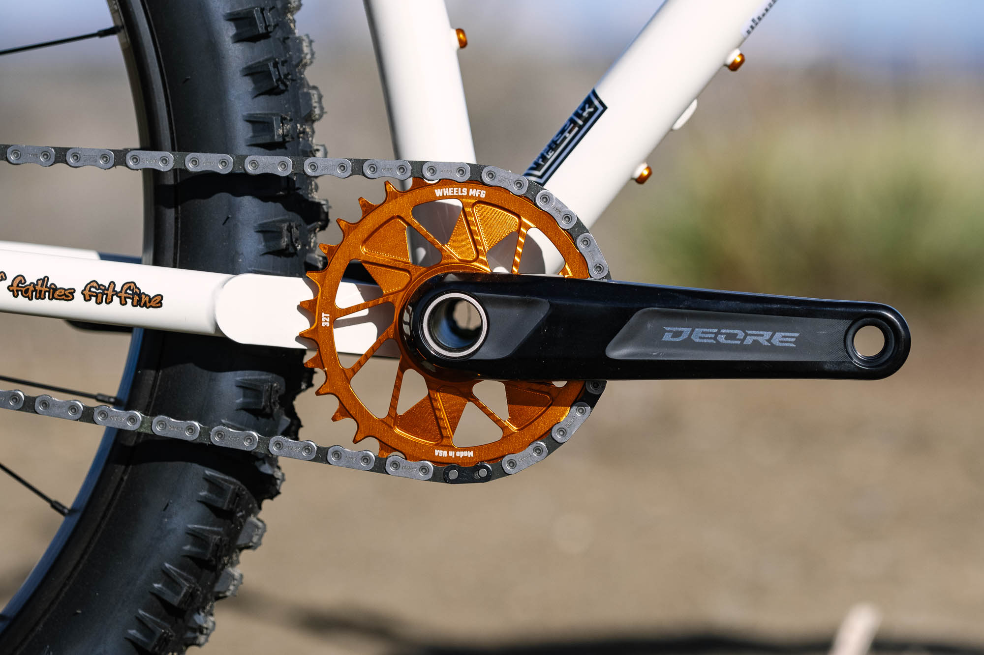 The build Wheels MFG put together is an upgraded version of the stock, rigid build. It has Tektro HD-M275 disc brakes, 27.5 x 3.0″ Surly Dirt Wizard tires, a Shimano Deore crankset, and nearly everything else has been upgraded with Wheels MFG’s machined Satin Orange components. It’s a size large, which is suited to ~5’9″ to 6’2″ tall riders.