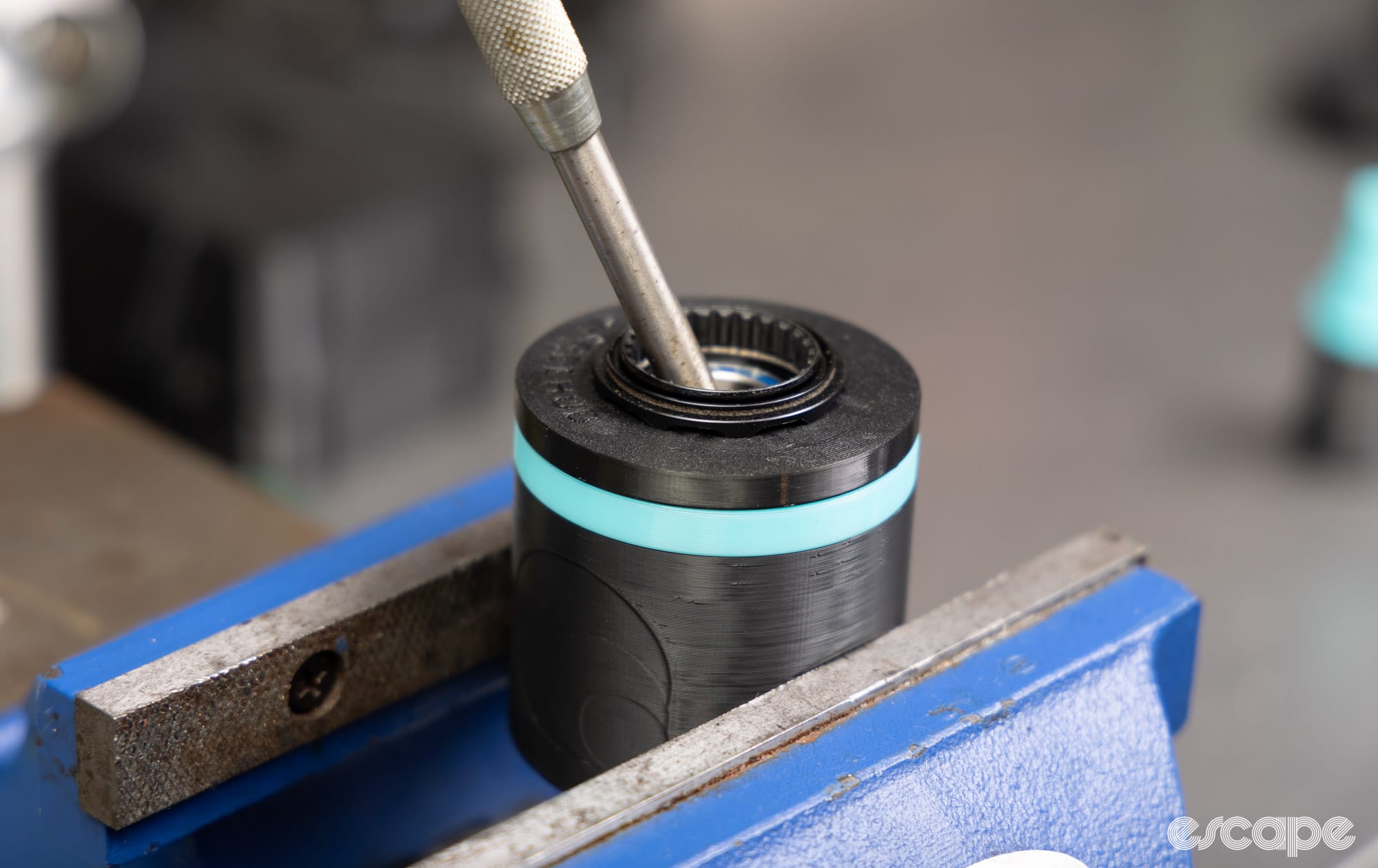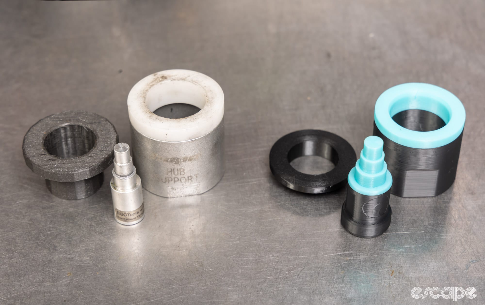 Similarly, the use of dual materials is seen in the Hub Axle Removal and Freehub Support kit (US$56), which again offers non-marring materials at points of contact. This kit is quite nice and replicates the purpose of what I’d previously achieved by piecing together a Hope hub support tool (with custom-machined flats for use in a bench vise), a BSC axle driver, and my own 3D-printed freehub insert.