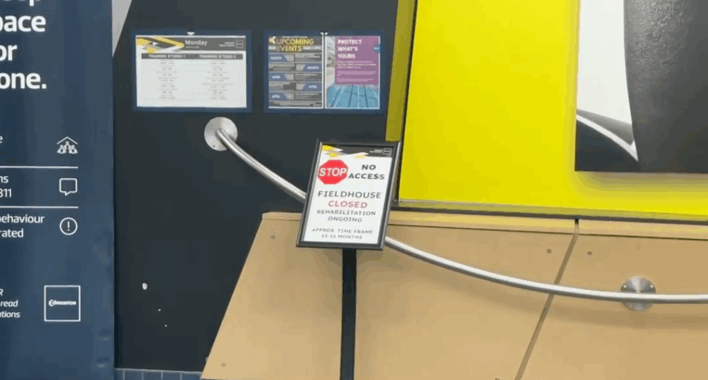 A sign showing the Kinsmen Fieldhouse is closed. (CityNews)
