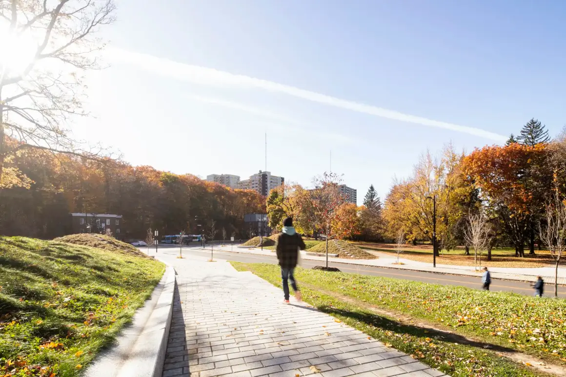 The knolls and their integrated benches create inviting spaces for rest, transforming the area into both a meeting place and an outdoor hall, marking the gateway to the unique, landscape experience of Mount Royal.