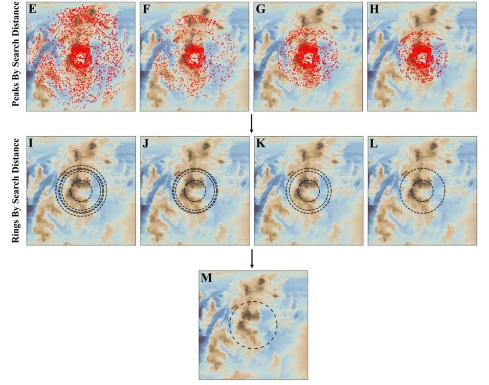 The top row shows measurements of small peaks in the region around the main crater. The middle row shows different ring solutions. The bottom panel shows the final apparent outer ring solution. Image Credit: Garvin et al. 2026. PSJ.