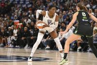 Golden State Valkyries center Temi Fagbenle (14) looks to drive past Minnesota Lynx forward Alanna Smith (8) during the first half of Game 1 in the first round of the WNBA basketball playoffs Sunday, Sept. 14, 2025, in Minneapolis.
