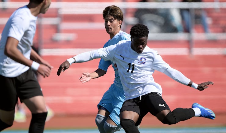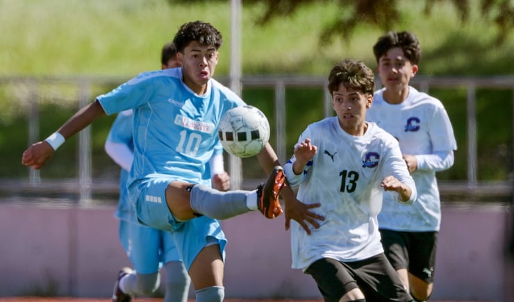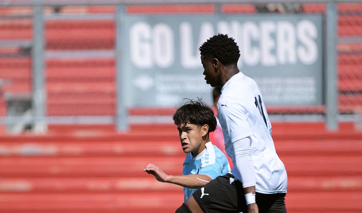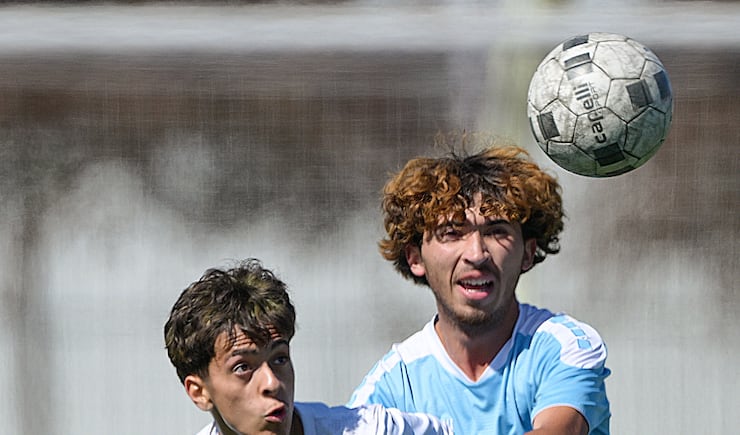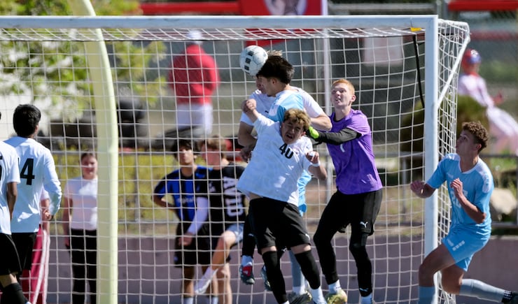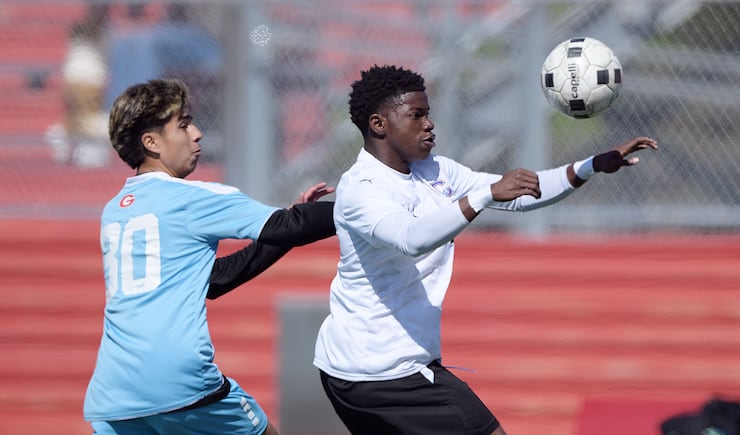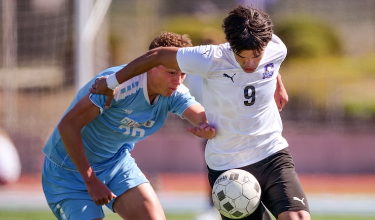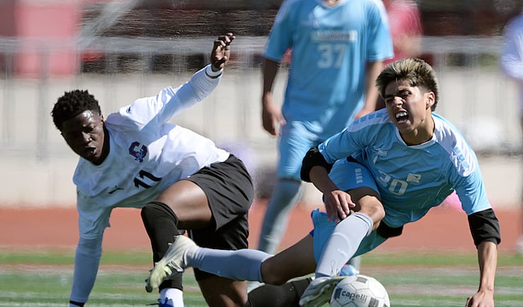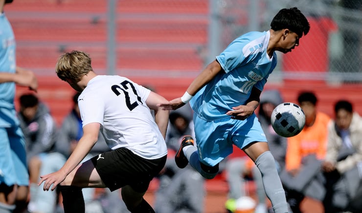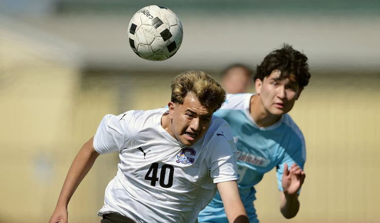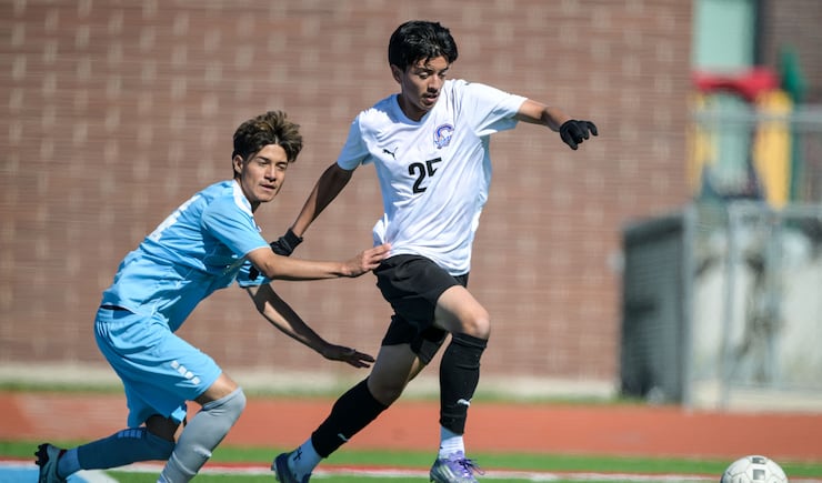 Granger’s Chris Castro and Cyprus’ Alberto Garcia Rodreguez battle for the ball as they play at Granger on Friday, April 17, 2026. Lone Peak won 5-4. | Scott G Winterton, Deseret News