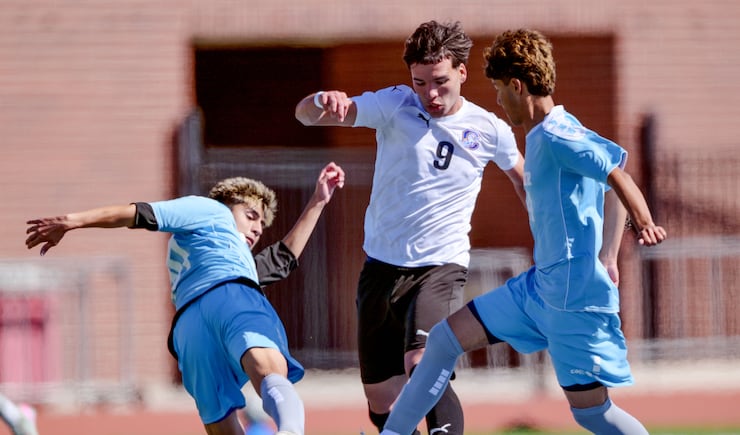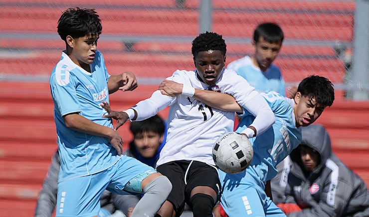 Cyprus’ Richard Crabbe battles Granger’s Joshua Bautista and Chris Castro as they play at Granger on Friday, April 17, 2026. Lone Peak won 5-4. | Scott G Winterton, Deseret News