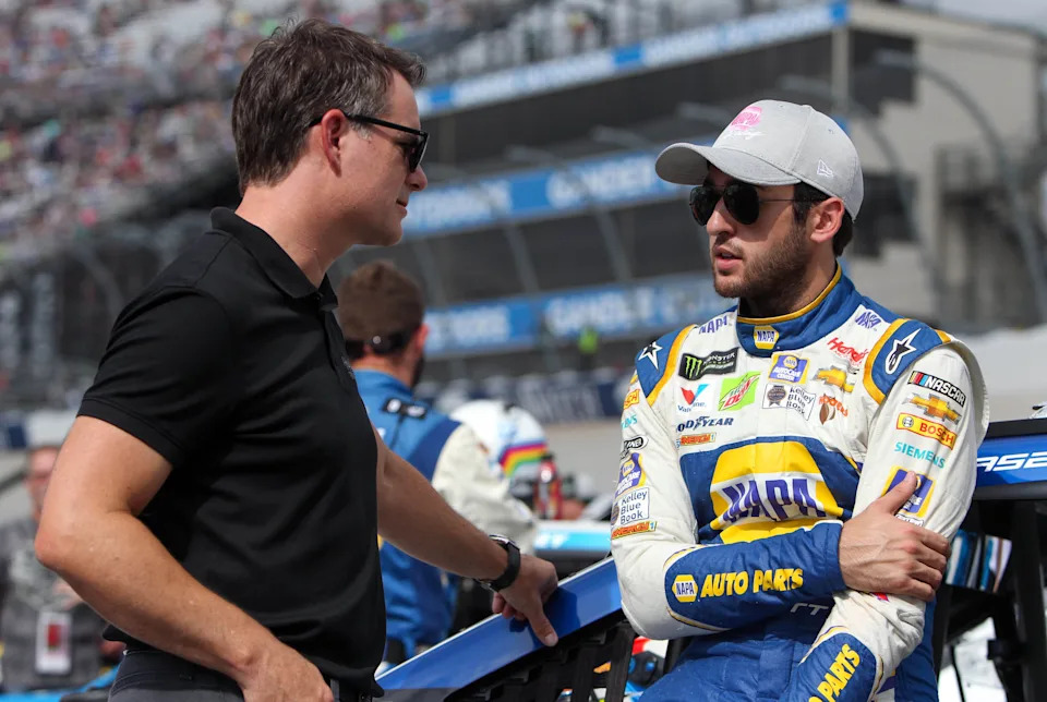 Oct 7, 2018: NASCAR Cup Series driver Chase Elliott (right) talks with former driver Jeff Gordon (left) prior to the Gander Outdoors 400 at Dover International Speedway.
