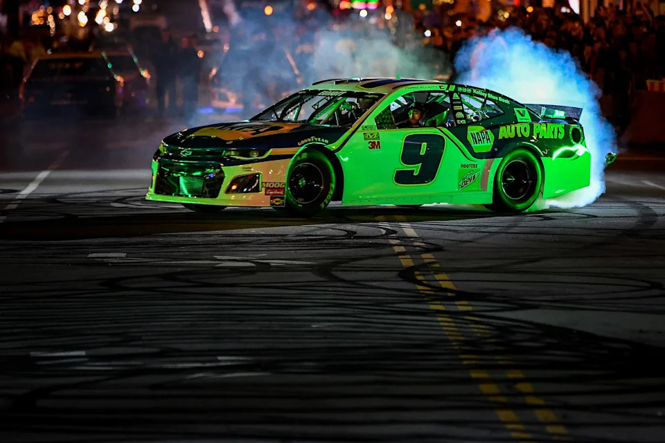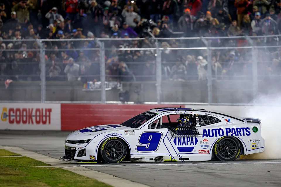 WINSTON SALEM, NORTH CAROLINA – FEBRUARY 02: Chase Elliott, driver of the #9 NAPA Auto Parts Chevrolet celebrates with a burnout after winning the Cook Out Clash at Bowman Gray Stadium on February 02, 2025 in Winston Salem, North Carolina. (Photo by Sean Gardner/Getty Images)