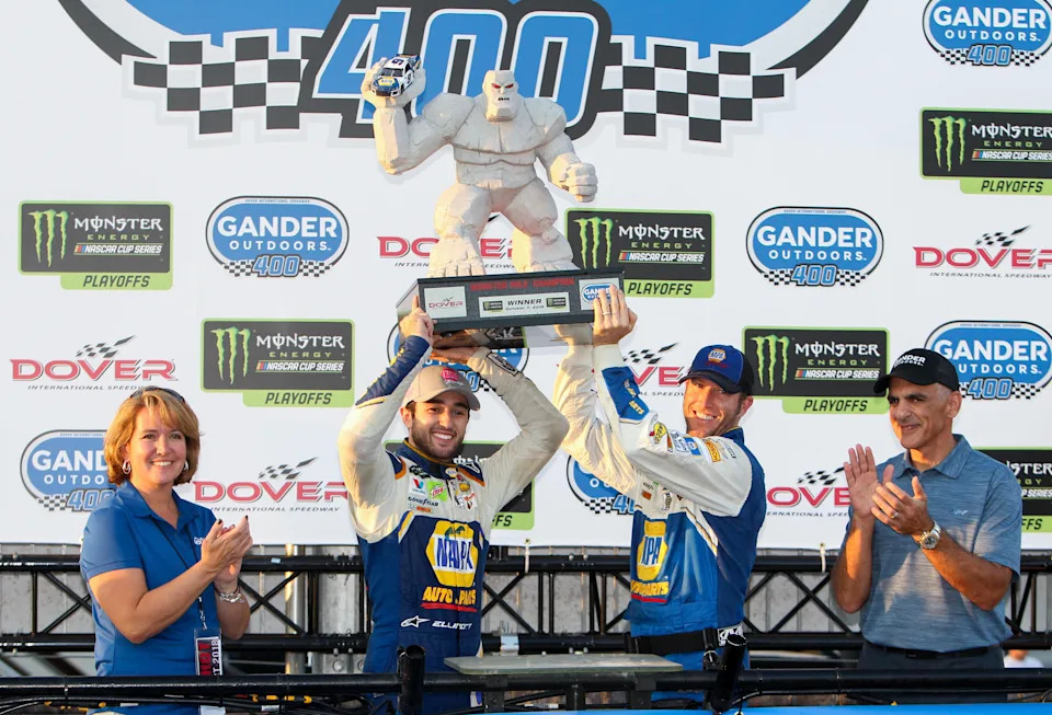 Chase Elliott, second from left, raises the Miles the Monster trophy in victory lane with crew chief Alan Gustafson after winning the 2018 playoff race at Dover International Speedway.