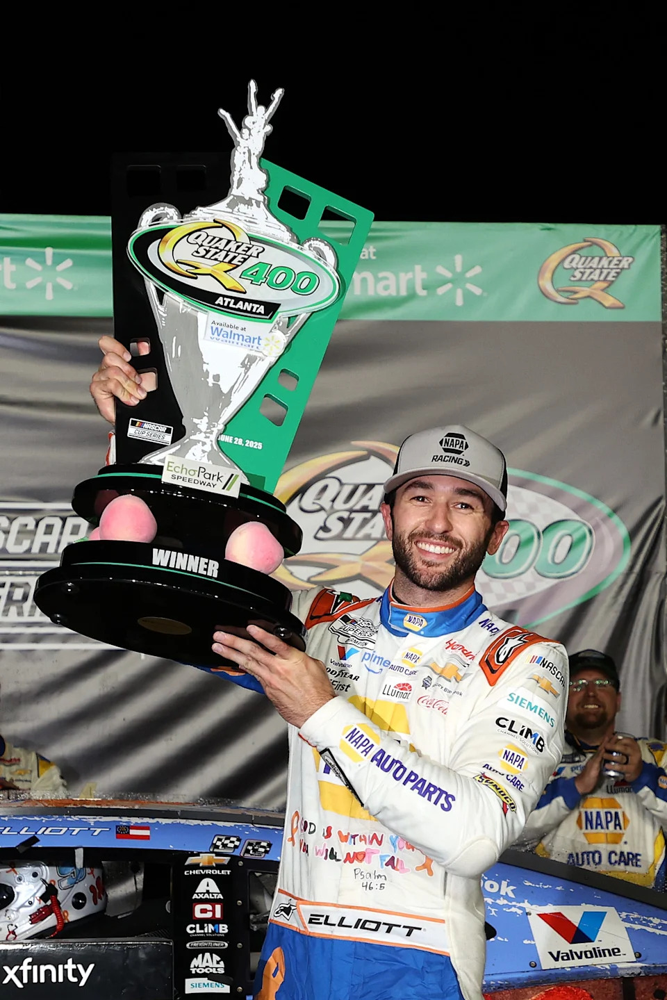 HAMPTON, GEORGIA – JUNE 28: Chase Elliott, driver of the #9 NAPA/Children’s Chevrolet, celebrates in victory lane after winning the NASCAR Cup Series Quaker State 400 Available at Walmart at Echo Park Speedway on June 28, 2025 in Hampton, Georgia. (Photo by Krista Jasso/Getty Images)