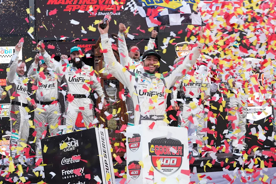 MARTINSVILLE, VIRGINIA – MARCH 29: Chase Elliott, driver of the #9 UniFirst Chevrolet, celebrates after winning the NASCAR Cup Series Cook Out 400 at Martinsville Speedway on March 29, 2026 in Martinsville, Virginia. (Photo by Jacob Kupferman/Getty Images)