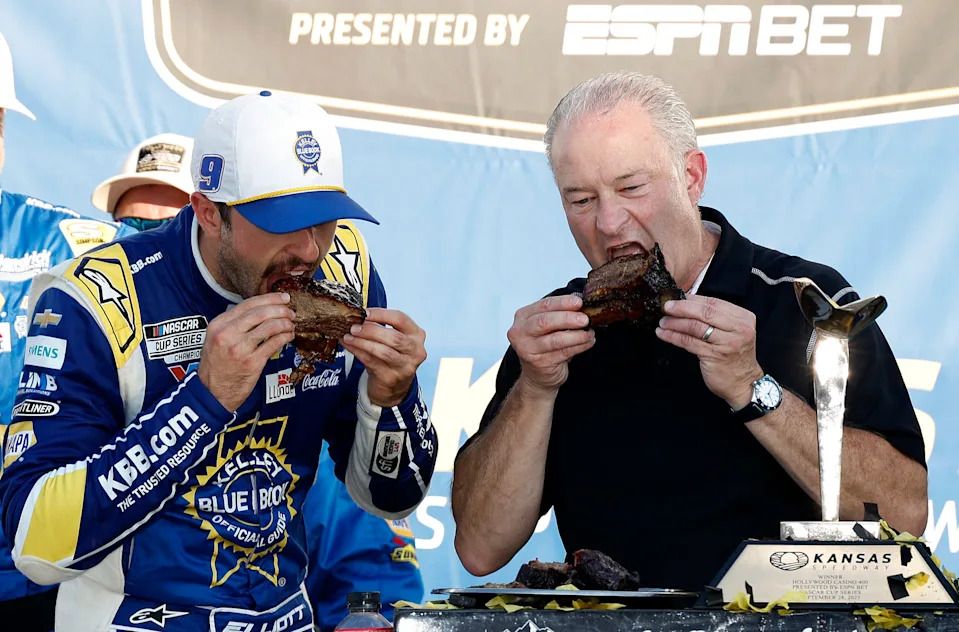 KANSAS CITY, KANSAS – SEPTEMBER 28: Chase Elliott, driver of the #9 Kelley Blue Book Chevrolet, and Kansas Speedway President Pat Warren eat ribs in victory lane after winning the NASCAR Cup Series Hollywood Casino 400 Presented by ESPN BET at Kansas Speedway on September 28, 2025 in Kansas City, Kansas. (Photo by Sean Gardner/Getty Images)