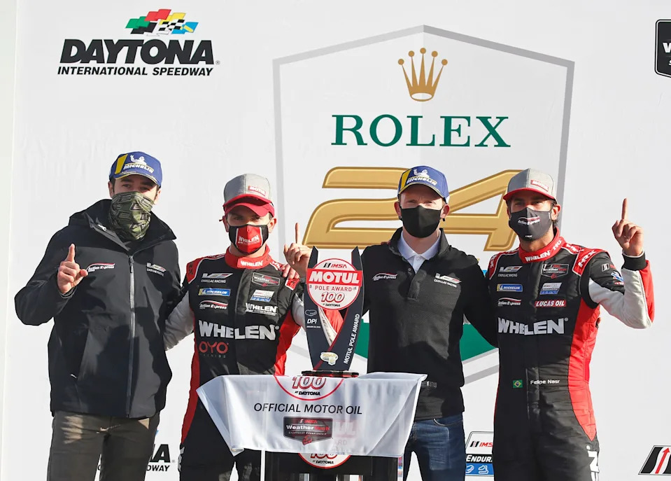 Chase Elliott, Luis Derani, Mike Conway and Felipe Nasr celebrate in victory lane after winning the Motul Pole Award 100 race at the Roar Before the 24 at Daytona International Speedway, Sunday, Jan. 24, 2021.