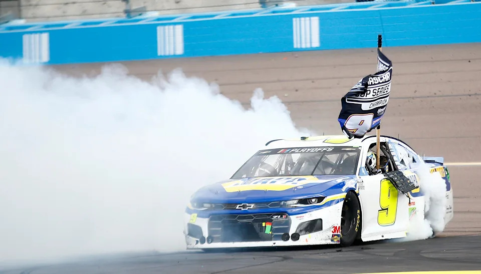 Chase Elliott does a burnout after winning the Season Finale 500 and capturing the 2020 NASCAR Cup Series Championship at Phoenix Raceway in Phoenix, Ariz. on Nov. 8, 2020.