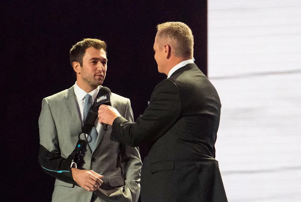Chase Elliott talks to Marty Snider after winning the Most Popular at the 2023 NASCAR Award banquet at Music City Center in Nashville, Tenn., Thursday, Nov. 30, 2023.