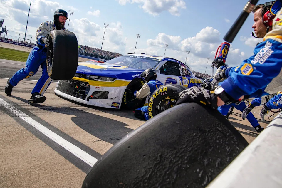 NASCAR Cup Series driver Chase Elliott (9) makes a pit stop during the NASCAR Cup Series Ally 400 race at the Nashville Superspeedway in Lebanon, Tenn., Sunday, June 20, 2021.