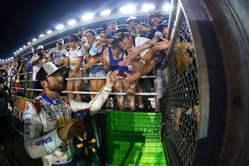 HAMPTON, GEORGIA – JUNE 28: Chase Elliott, driver of the #9 NAPA/Children’s Chevrolet, celebrates with fans after winning the NASCAR Cup Series Quaker State 400 Available at Walmart at Echo Park Speedway on June 28, 2025 in Hampton, Georgia. (Photo by Sean Gardner/Getty Images)