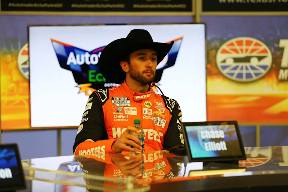 Apr 14, 2024; Fort Worth, Texas, USA; NASCAR Cup Series driver Chase Elliott (9) answers questions from the media after winning the NASCAR Cup Series AutoTrader EchoPark 400 at Texas Motor Speedway. Mandatory Credit: Michael C. Johnson-USA TODAY Sports