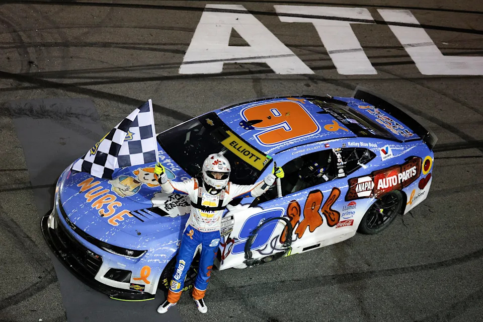 HAMPTON, GEORGIA – JUNE 28: Chase Elliott, driver of the #9 NAPA/Children’s Chevrolet, celebrates with the checkered flag after winning the NASCAR Cup Series Quaker State 400 Available at Walmart at Echo Park Speedway on June 28, 2025 in Hampton, Georgia. (Photo by Sean Gardner/Getty Images)