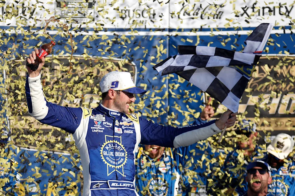 KANSAS CITY, KANSAS – SEPTEMBER 28: Chase Elliott, driver of the #9 Kelley Blue Book Chevrolet, celebrates in victory lane after winning the NASCAR Cup Series Hollywood Casino 400 Presented by ESPN BET at Kansas Speedway on September 28, 2025 in Kansas City, Kansas. (Photo by Sean Gardner/Getty Images)
