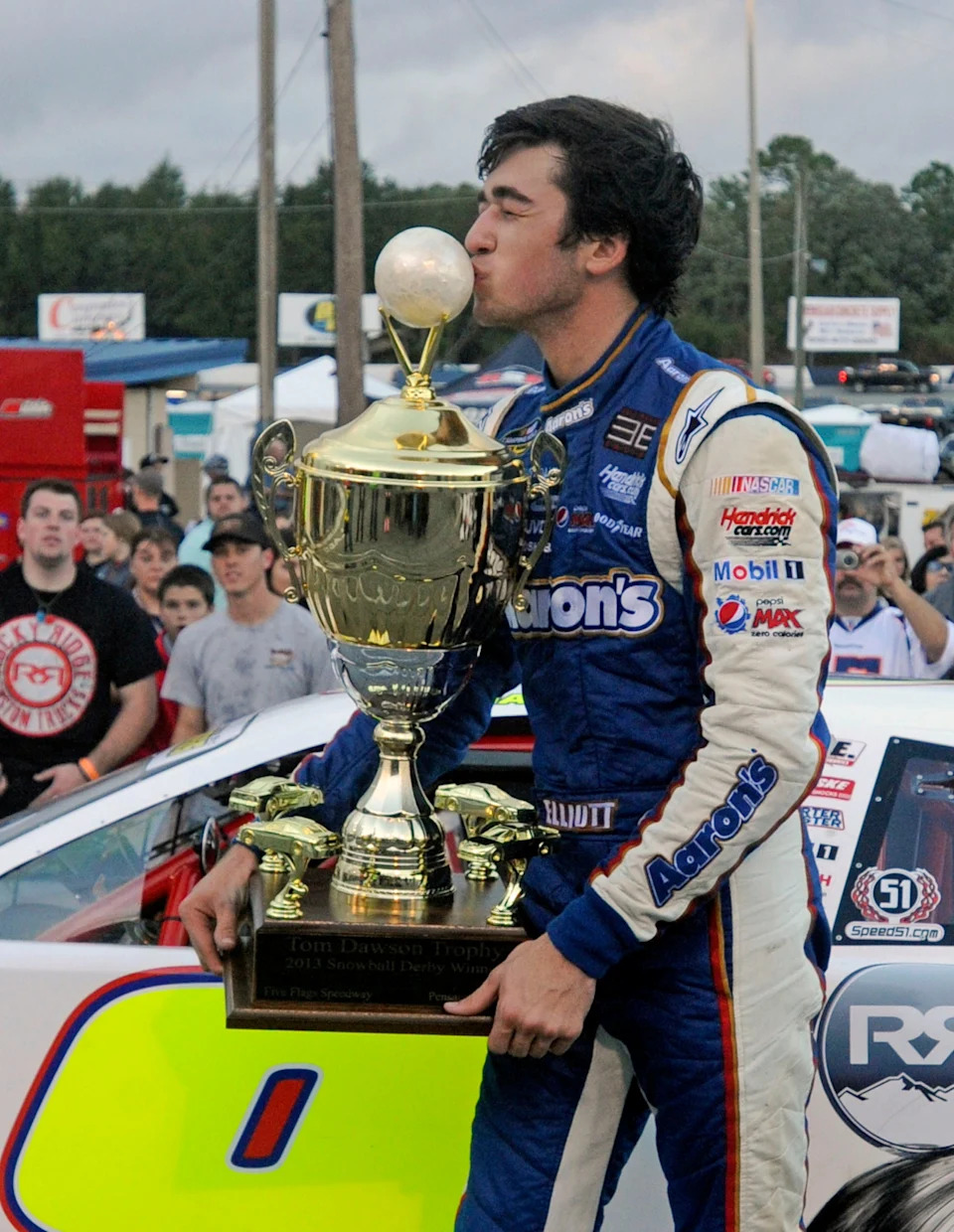 Chase Elliott celebrates by kissing the snowball on his trophy after winning the 2013 Snowball Derby Sunday at Five Flags Speedway.