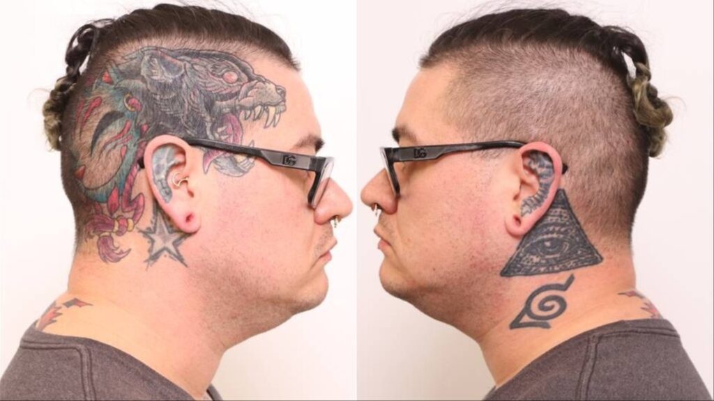 An Edmonton tattoo artist, seen here from both sides, has been accused of sexually assaulting some of his clients. (Courtesy: Edmonton Police Service)