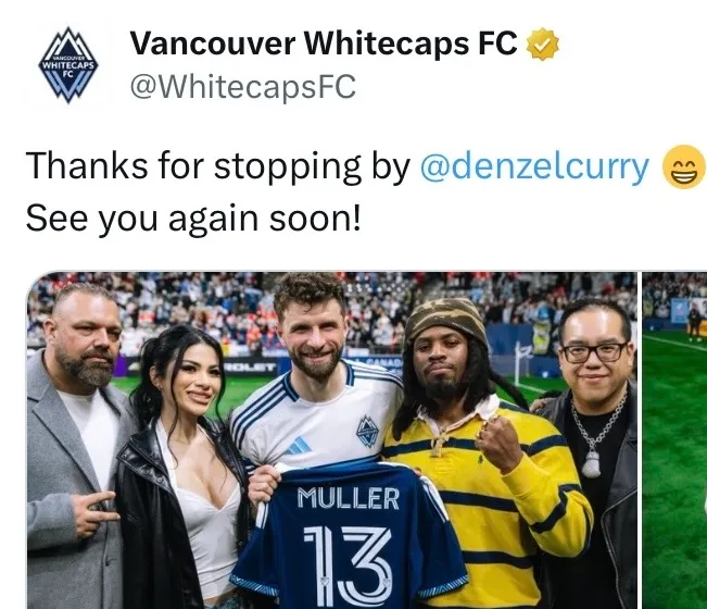 Unlocked Entertainment’s Justin Smith (left) with Whitecaps captain Thomas Muller (centre) and Denzel Curry (second from right) before his April 4 concert at The Key. (Whitecaps FC/X.com)