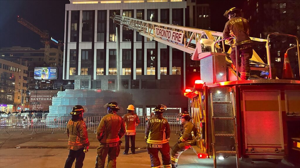Toronto Fire Services crews can be seen putting water on a massive ice sculpture teasing a new album by Drake. CITYNEWS / Rob Ramlackhan