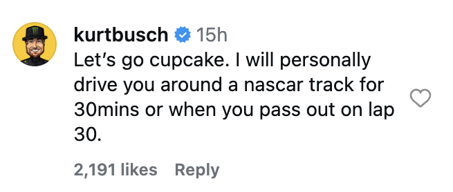 “Let’s go cupcake. I will personally drive you around a nascar track for 30mins or when you pass out on lap 30,” Busch wrote in response to Smith’s comments on social media.