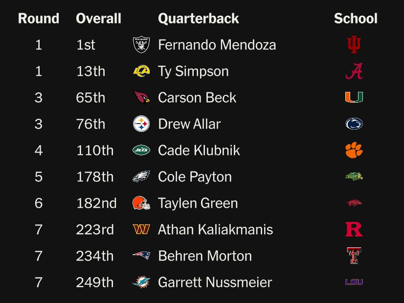Back to quarterbacks for a minute: The first one drafted in each class has a better pro career than his QB classmates 40 percent of the time, historically. That drops to 13 percent for the second and third quarterbacks drafted, in this case the Rams’ Ty Simpson and Cardinals’ Carson Beck. Here’s where passers landed:
