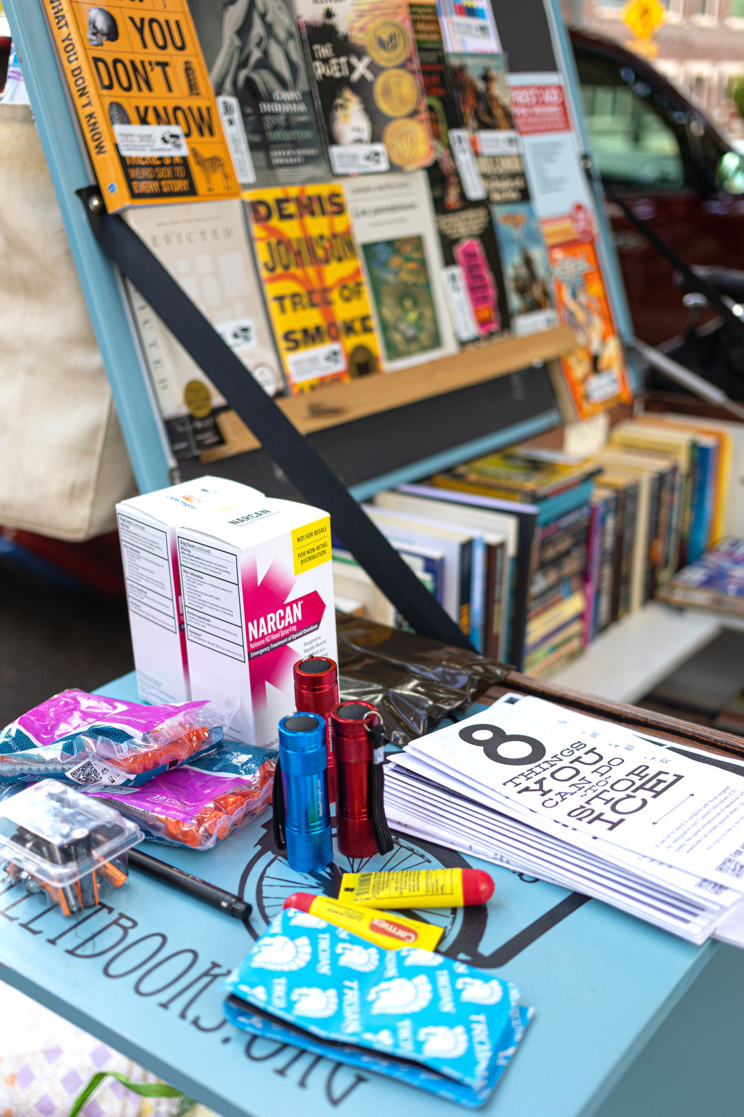 Still, Street Books doesn’t eschew the basics. That day at the church, patrons walked away with LED flashlights, wet wipes, bandages, and reading glasses, all of which hung informally from the trike’s handlebars in reusable shopping bags. The library also gave out 3,500 doses of the opioid overdose prevention medicine Naloxone last year. Codirector of programs and operations Josh Pollock says these harm-reduction efforts follow naturally from book lending. “You spend this time getting to know somebody,” he says, “and you want them to be healthy in this life.”