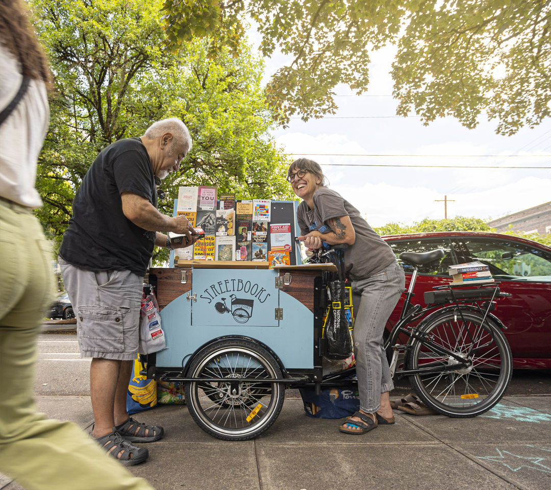 At 11am each Wednesday, a Street Books librarian pedals a trike retrofitted as a mobile library onto the sidewalk in front of Trinity Episcopal Cathedral at NW 19th and Davis. One morning this spring, Kindred by Octavia Butler, a self-help guide called The Grief Recovery Handbook, Harlem Shuffle by Colson Whitehead, and a volume from a Star Trek serial sat on a slim shelf inside the bike’s open lid. A Springsteen biography would later generate a few nostalgic conversations.
