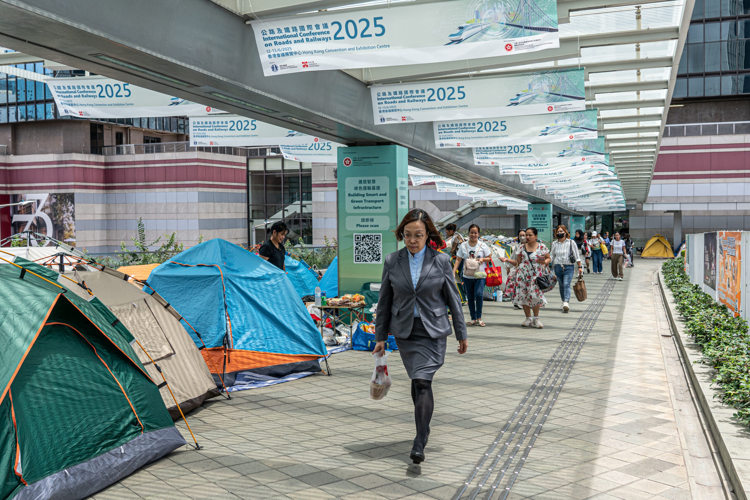 A businesswoman walks past tents set up by domestic workers enjoying their day off on a Sunday in June this year. These workers are the backbone of Hong Kong’s economy, allowing locals to participate more in the job market.