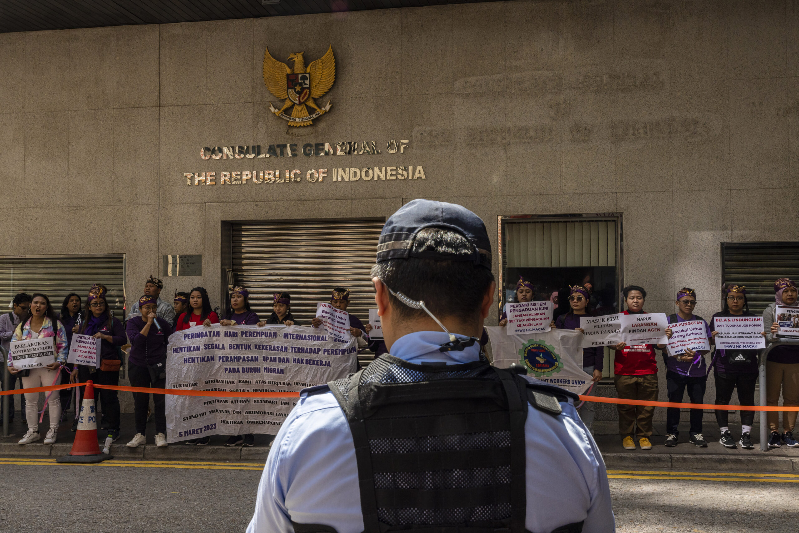 A police officer observes a protest by domestic workers advocating for migrants’ rights, outside the Indonesian Consulate in Hong Kong in March 2023. AP Photo/Louise Delmotte