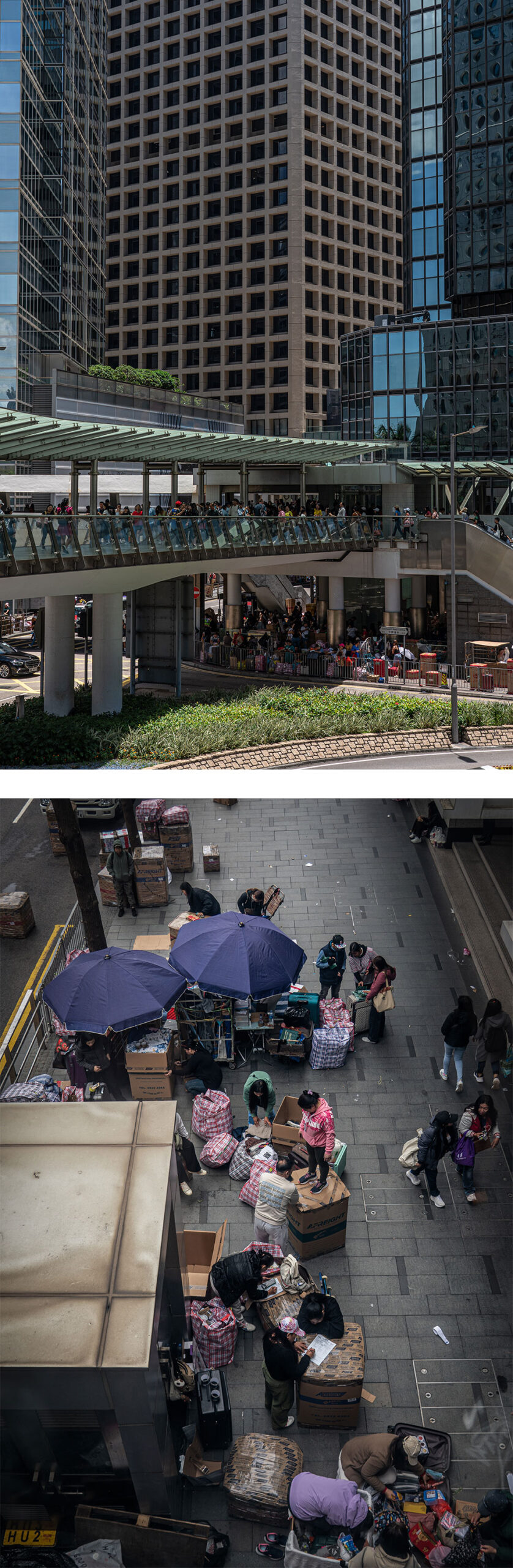Hong Kong, a city of 7.5 million, has one of the highest ratios of foreign domestic workers in the world, numbering more than 368,000 last year. Here, they congregate on cardboard boxes on a Sunday in March.