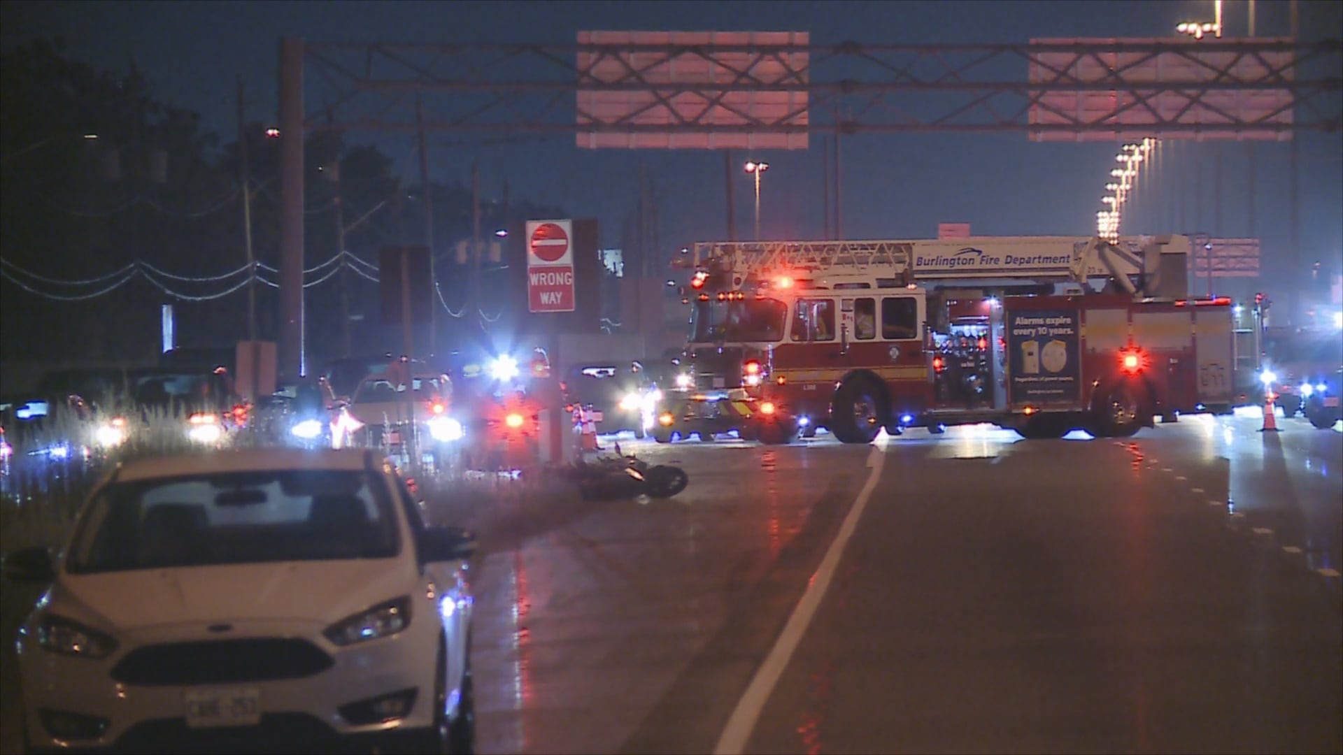 OPP investigating a serious motorcycle crash that temporarily shut down a stretch of the QEW in Burlington on Saturday August 16, 2025 (CP24 photo).