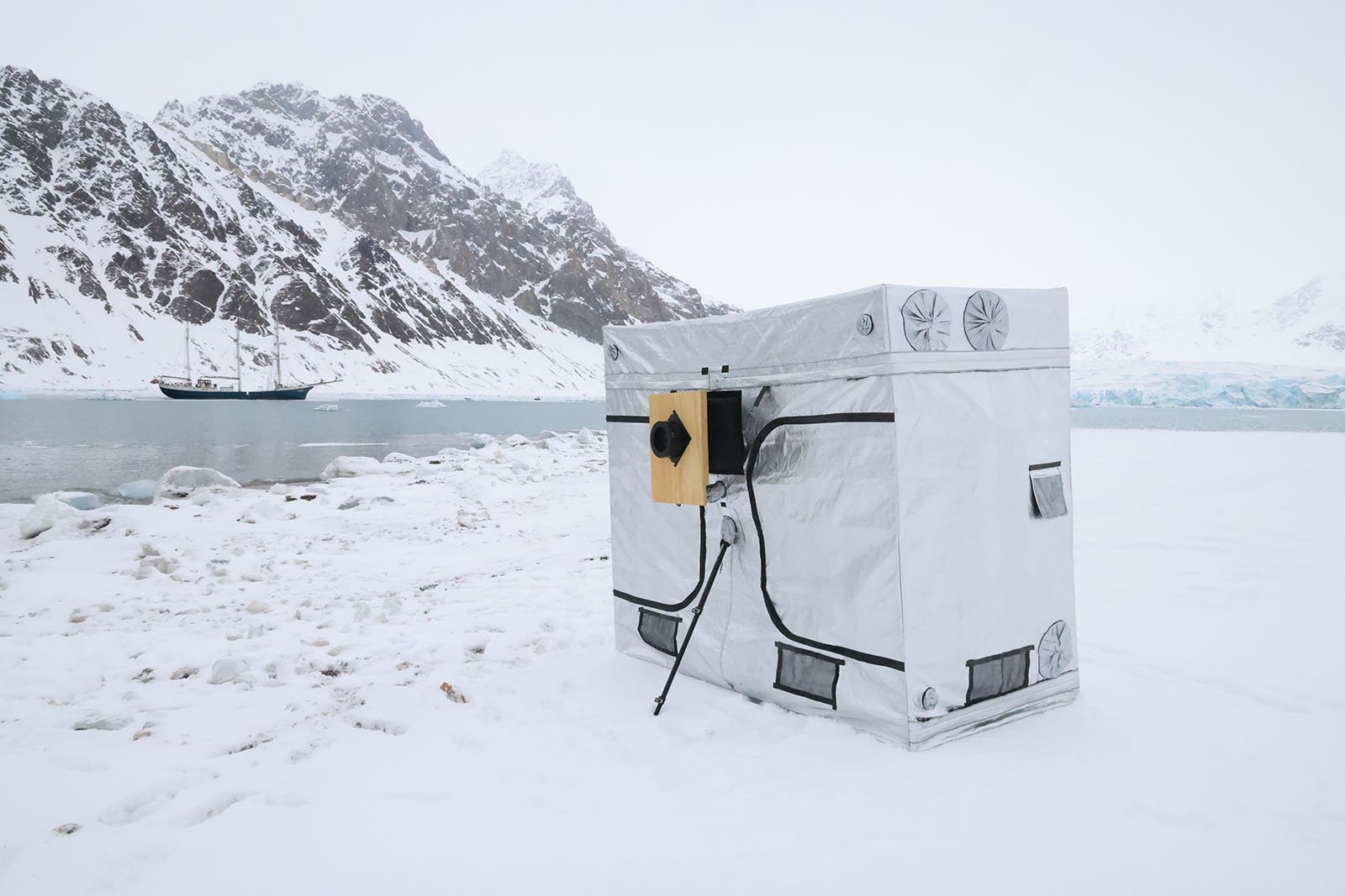 Duke built a large tent that acts as a camera obscura which the ice lens is attached to.
