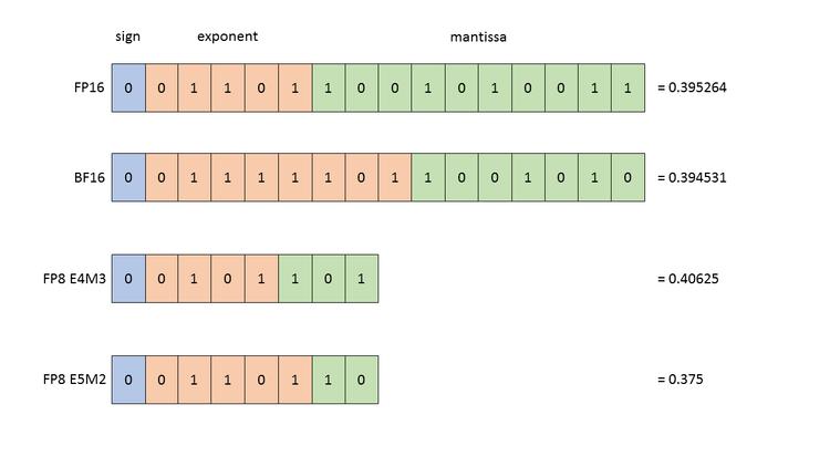 So, scientists invented floating – point numbers (floating point), which is the FP in FP8. As the name suggests, the position of the decimal point is “floating”. It can be written as a common number like 3.14159 or an astronomical exponent like 6.02×10²³. Essentially, a floating – point number splits a number into three parts: the sign bit, the exponent, and the mantissa. The sign bit determines the sign, the exponent determines the position of the decimal point, and the mantissa determines the precision.