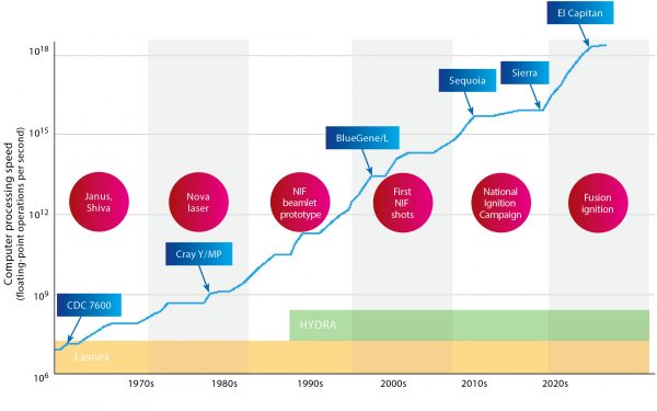 For more than 50 years, Livermore’s laser (red) and computing (blue) technologies have advanced alongside—and to the mutual benefit of—each other. Development continues on the Lasnex and HYDRA codes as simulation needs evolve.