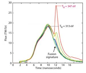 Lasnex and HYDRA simulations predicted the hohlraum reheating phenomenon, which was demonstrated in multiple NIF shots (plotted in different colors). X-ray energy exiting the hohlraum’s laser entrance holes is shown in gross terawatts per steradian (Flux TW/Sr), while radiation temperature (TR) is measured in electronvolts (eV). The red spike of the N221204 ignition shot indicates a high hohlraum reheating signal.