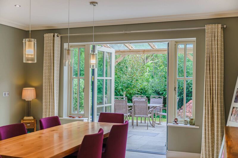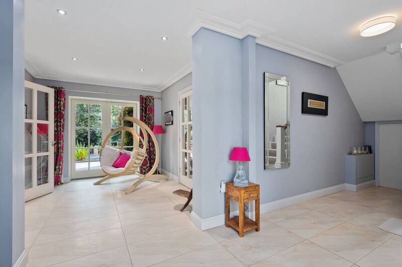 The back of the hallway, overlooking a south-facing patio and tree-ringed rear garden, is fully glazed. Light floods in through tall windows that frame the garden view.