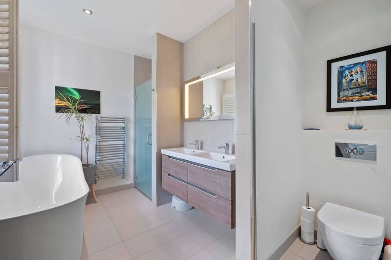 The main bedroom/suite has a feature electric fire, a dressing room with excellent storage, and a premium en suite with his-and-her wash-hand basins, and a shower unit and WC behind separate opaque doors. Heated towel rails are a feature of all en suite bathrooms — of which there are four in total. One en suite is reached via a walk-through wardrobe. The spacious landing feels like a room in itself and it’s laid out as such, with shelving and seating and a great deal of comfort.