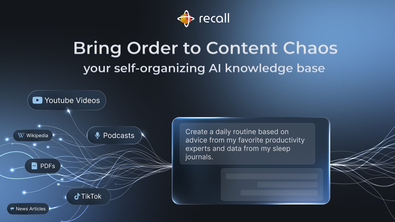Three-hour podcasts. Unread PDFs. Hours wasted on mediocre content while brilliant articles sit buried in bookmarks. Recall solves this. Turn scattered information into a self-organizing knowledge base that gets smarter as you use it.