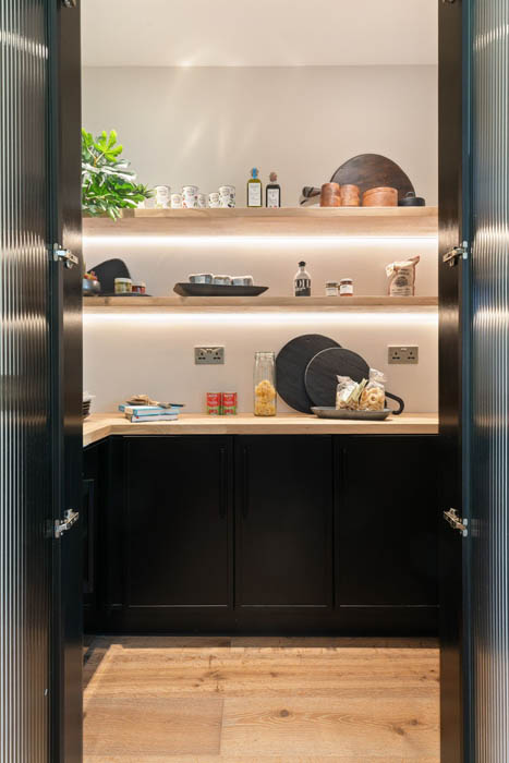 Undercabinet lighting is a feature that extends to the walk-in pantry, Buckley explains.
