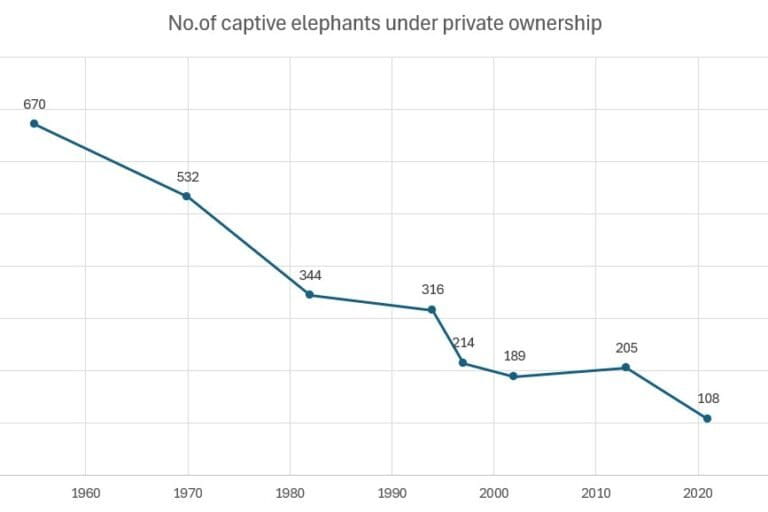 Prakash’s 2020 study found 39 criminal proceedings filed by the DWC and CID between 2008 and 2018, revealing systemic corruption — including forged registration documents, altered photographs and backdated applications to disguise wild-caught elephants as captive-born.