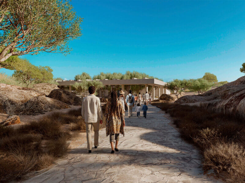 Visitors enter via a pathway dotted with large rock formations. (Courtesy Malcolm Reading Consultants)