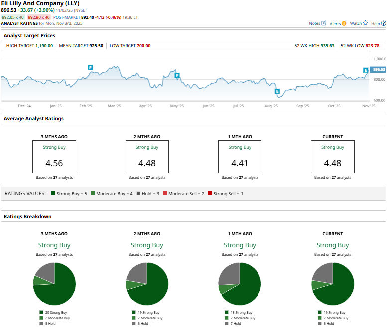 On Oct. 31, Cantor Fitzgerald analyst Carter Gould maintained an “Overweight” rating on LLY and raised the price target from $925 to $985.