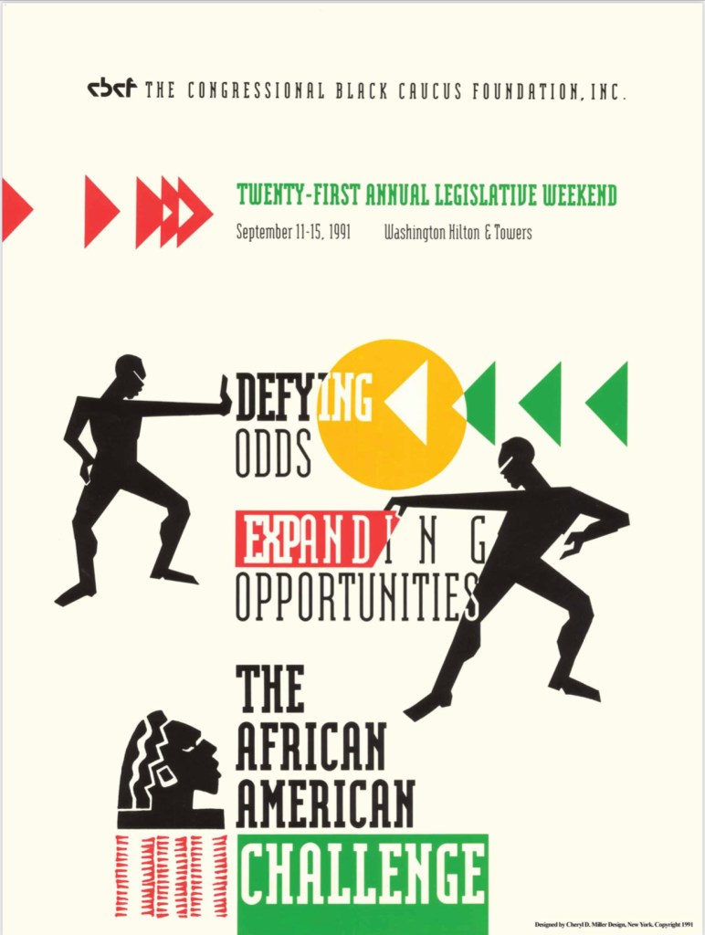 Earlier this year, I received a mysterious email. A permissions specialist wanted to license my 1991 poster, “Defying Odds, Expanding Opportunities: The African American Challenge,” (below right) designed for my client, the Congressional Black Caucus Foundation, for use in the forthcoming 7th Edition of Meggs’ History of Graphic Design.