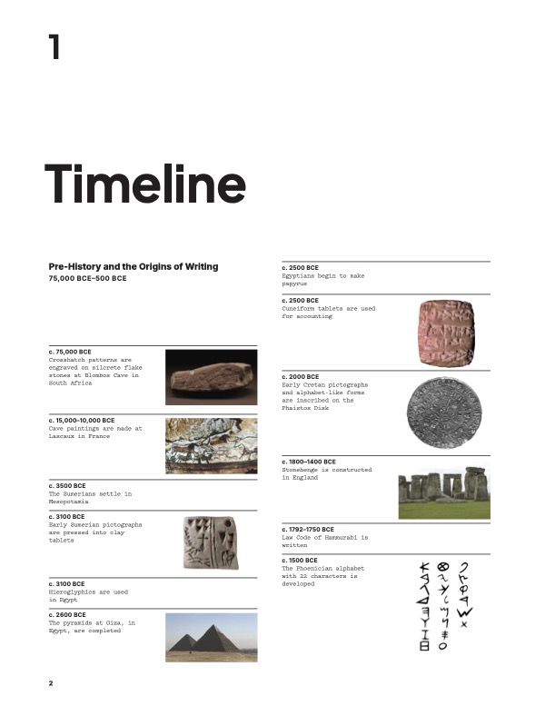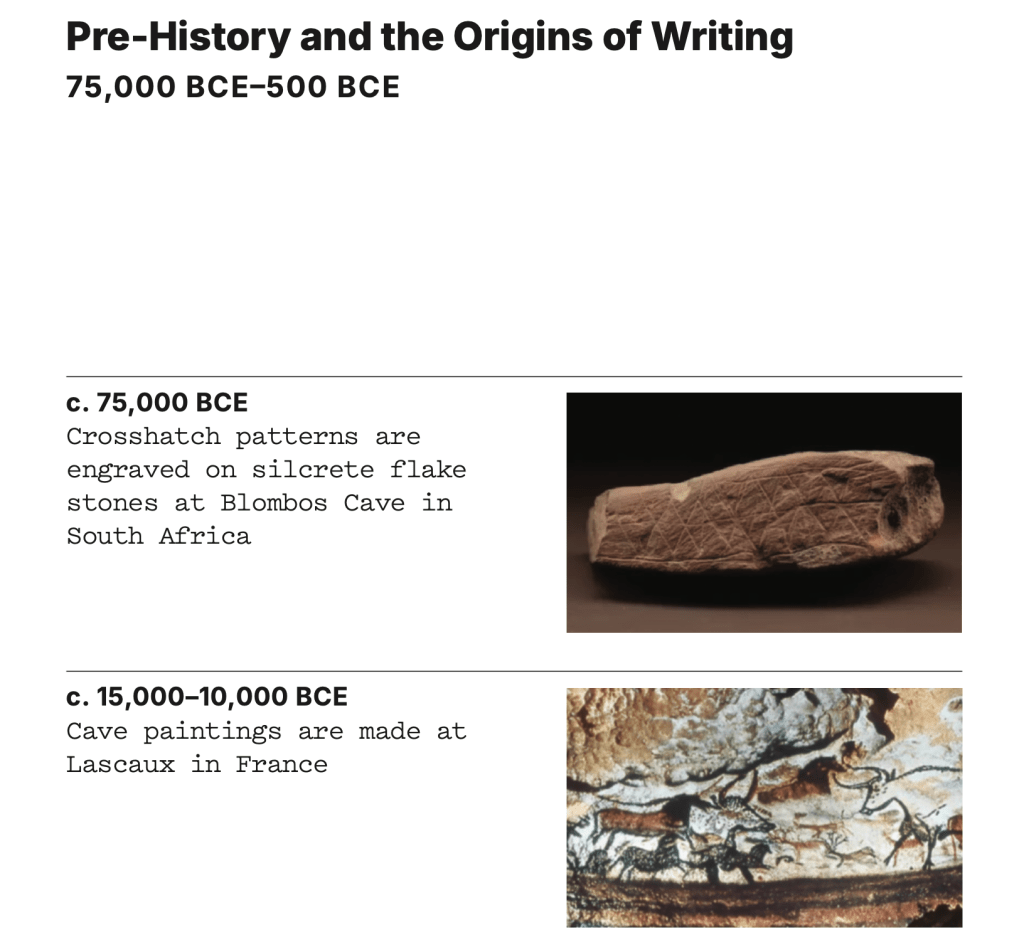 Left: Timeline from Meggs’ 7th Edition, page 2; Right: Detail of Blombos Cave patterns (South Africa) and Lascaux paintings (France)