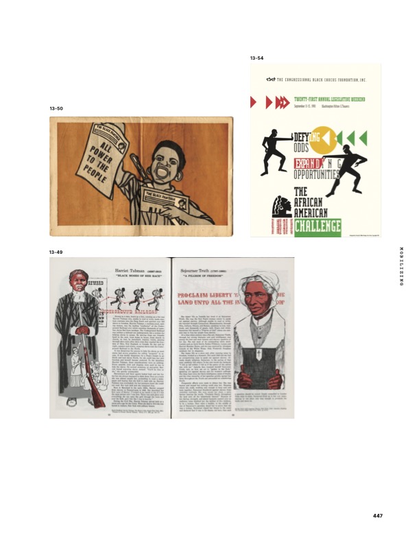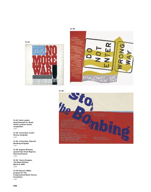 “Mobilizing for Racial Equality,” featuring work by Herb Lulalin, Corita Kent, Eugene Winslow, Emory Douglas, and Cheryl. D. Miller, Meggs’ 7th Edition, pages 444-448