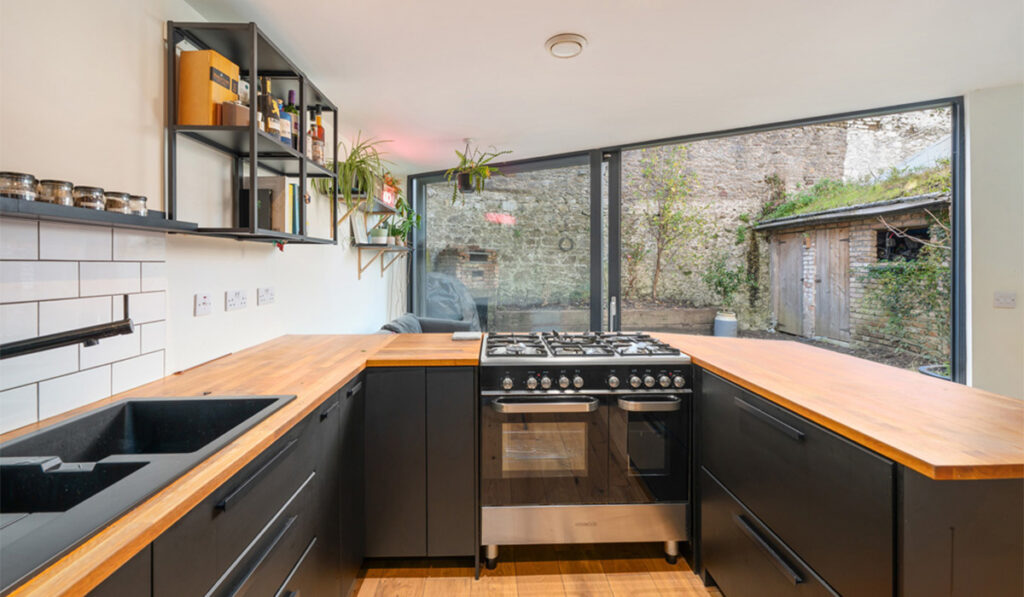 Inky-black units are set in a C-shape, facing the greenery. From the range cooker, you can look out over the sofa at nature – thanks to the installation of floor-to-ceiling sliding glass doors that blur the lines between inside and out.