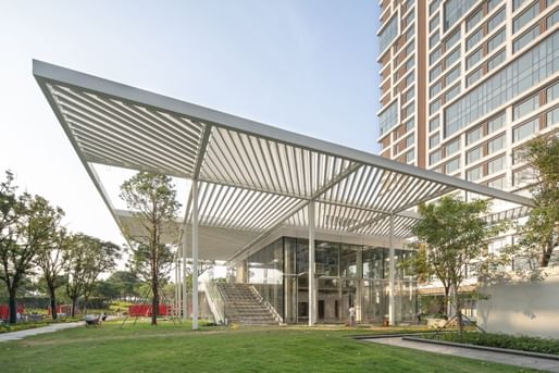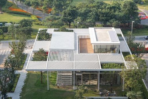 Located within a new park in Shenzhen’s third central business district, Helio House is designed as a community amenity, housing a cafe, bookstore, and event space within a compact glass pavilion. An expansive aluminum trellis covering an area five times larger than the building provides extensive shade while reducing cooling loads. The trellis features concave louvers that reflect diffuse light while minimizing heat transfer, creating a luminous yet cool environment.